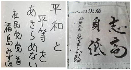 좌측은 일본 사민당 당수 후쿠시마 미즈호의 글솜씨, 오른쪽은 외무대신 아소 다로의 글솜씨. 그야말로 극과 극.