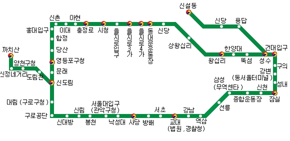 524> 을지로 3가 -> 시청 -> 신촌 -> 당산 -> 신도림 -> 신대방 -> 사당 -> 역삼 -> 종합운동장 -> 잠실 ->